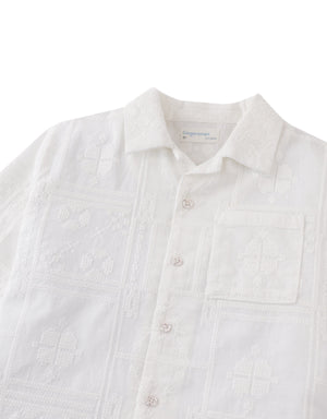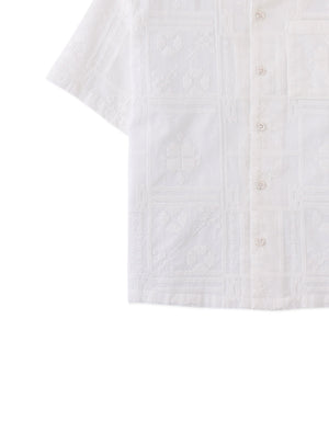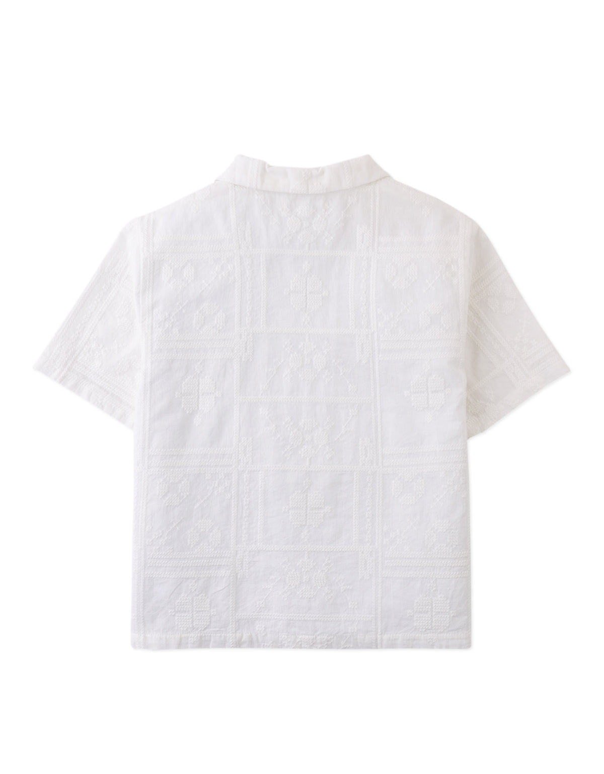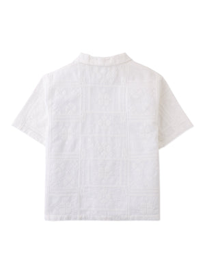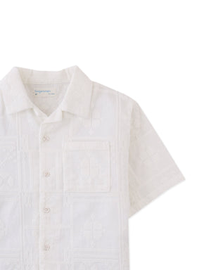 Embracing a casual, yet refined style, this white embroidered camp collar short sleeve button-down shirt adds a unique flair to your child's collection.