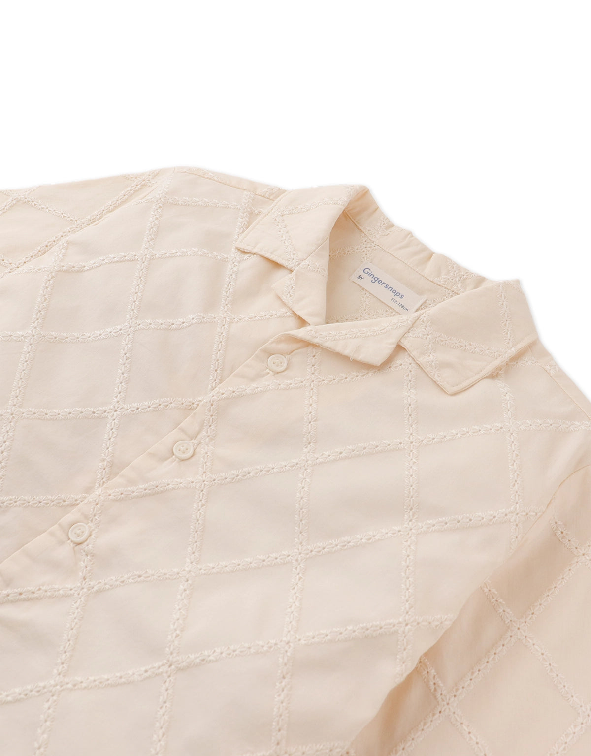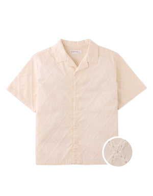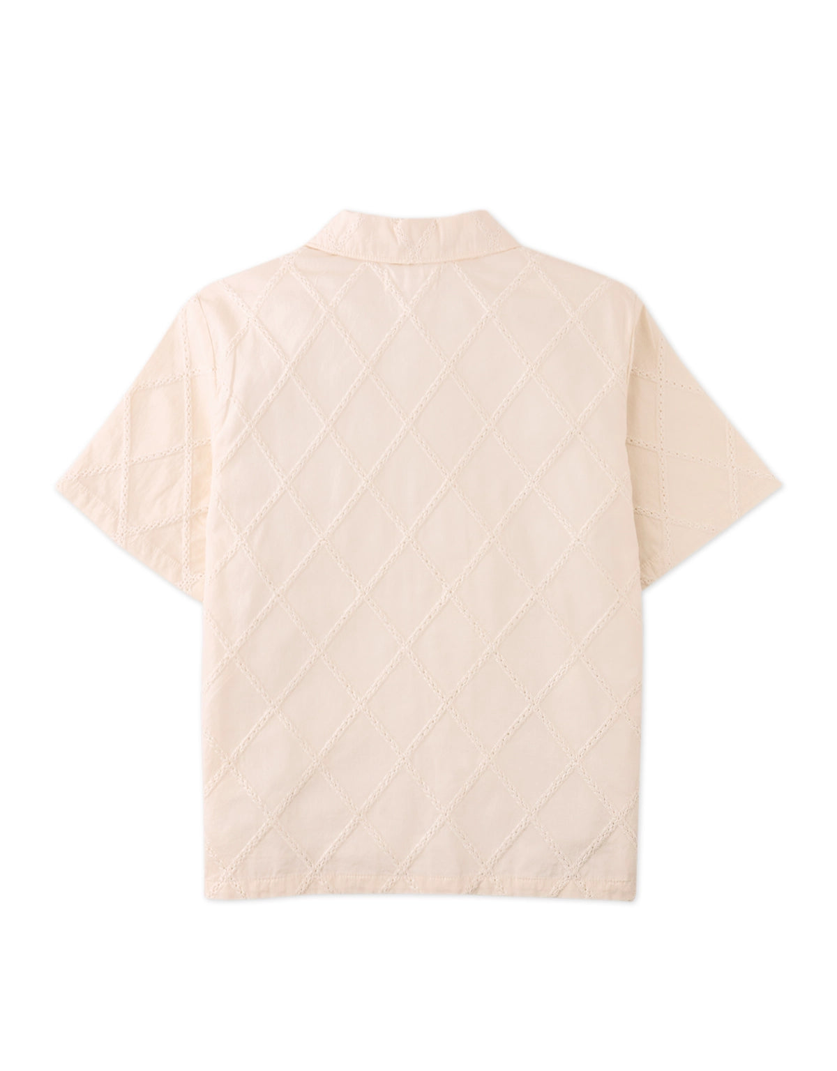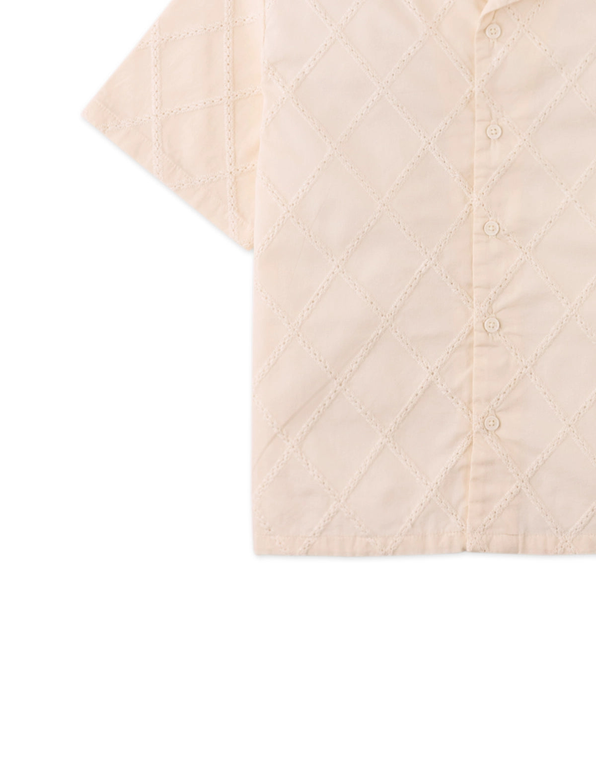 This beige short-sleeved eyelet-embroidered shirt blends texture and detail, creating a refined piece that elevates your little buddy's everyday outfits.