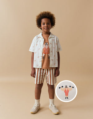 Get your little hero ready for action with our Wyatt shirt with muscle man all-over print.